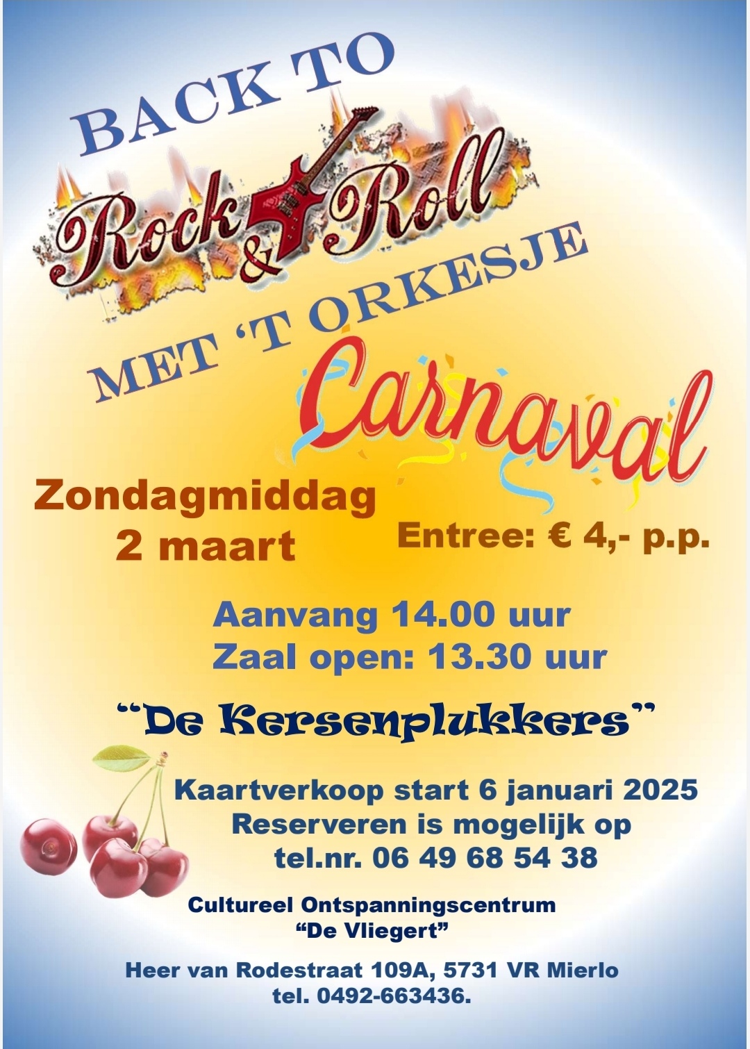 Wat een succes was vorig jaar Back to Rock&Roll op de carnavalszondag. Een volle zaal met enthousiaste mensen die al dan niet het Carnavalsgedruis ontweken. Vele waren uitgedost in petticoat of hadden zich een vetkuif aangemeten. Natuurlijk hopen wij dat u ook gekleed komt in de stijl van de 60er jaren oftewel het Rock&Roll tijdperk. Laten we samen een kleurrijke middag van maken. En de sfeer van vorig jaar evenaren. Wij van de Kersenplukkers hebben zoveel mooie reacties gekregen dat we geen moment hebben getwijfeld of we het dit jaar moesten herhalen.