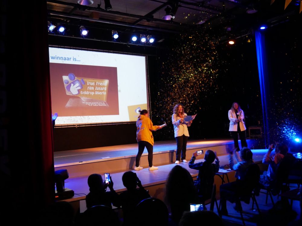 Schoolkinderen uit Geldrop-Mierlo, uit de groepen 7 en 8, hebben afgelopen week hun favo-film gekozen, tijdens het True Friend Film Festival in De Weeffabriek. Tijdens dit jaarlijkse festival waren vijf korte films genomineerd, speciaal voor de gelegenheid gemaakt door filmstudenten van vakschool SintLucas. De film ‘Echte vrienden’, van Jelle Coolen, Lars Grootjans, Yordi Janssen, Amy van Houtum en Bas Kantelberg, ging er met de wisseltrofee vandoor.