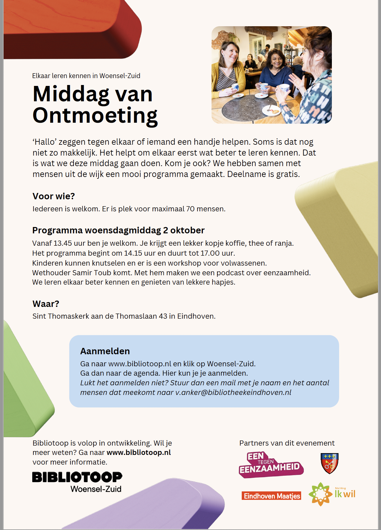 In Woensel-Zuid is op 2 oktober een speciale themamiddag in de Sint Thomaskerk. Deze middag is in samenwerking met inwoners, Stichting Ik Wil, Eindhoven Maatjes en de Thomaskerk tot stand gekomen. Iedereen van jong tot oud is welkom. De kinderen kunnen knutselen en voor volwassenen is er een interessant programma en een workshop. De Eindhovense wethouder Samir Toub van diversiteit, zorg, jeugd en maatschappelijke ondersteuning is ook aanwezig. Hij wordt geïnterviewd voor een live podcast door Eindhoven Maatjes.