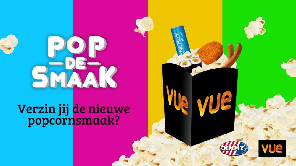 De bioscoopbezoeker krijgt bij het bestellen van een bakje popcorn al jaren dezelfde vraag: "Wilt u zoete of zoute popcorn?". Maar waarom bestaat er eigenlijk nog geen bamischijf, knakworst of sushi-popcorn? Vue lanceert vandaag in samenwerking met Jimmy's Popcorn de actie 'Pop de Smaak', waarbij de bioscoopketen heel Nederland oproept zijn eigen unieke smaak voor popcorn in te zenden. Naast een geldprijs voor de winnaar, wordt de winnende smaak uiteindelijk in productie gebracht en in alle Vue vestigingen verkocht. De actie gaat vandaag van start, en smaken kunnen worden ingezonden tot vrijdag 22 maart. Het inzenden van smaken kan via de website van Vue.