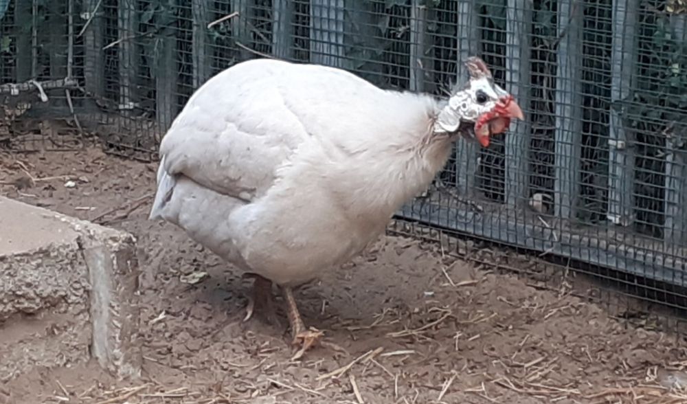 Poeli is een helmparelhoender die erg actief is en altijd in is voor een lekker hapje. We