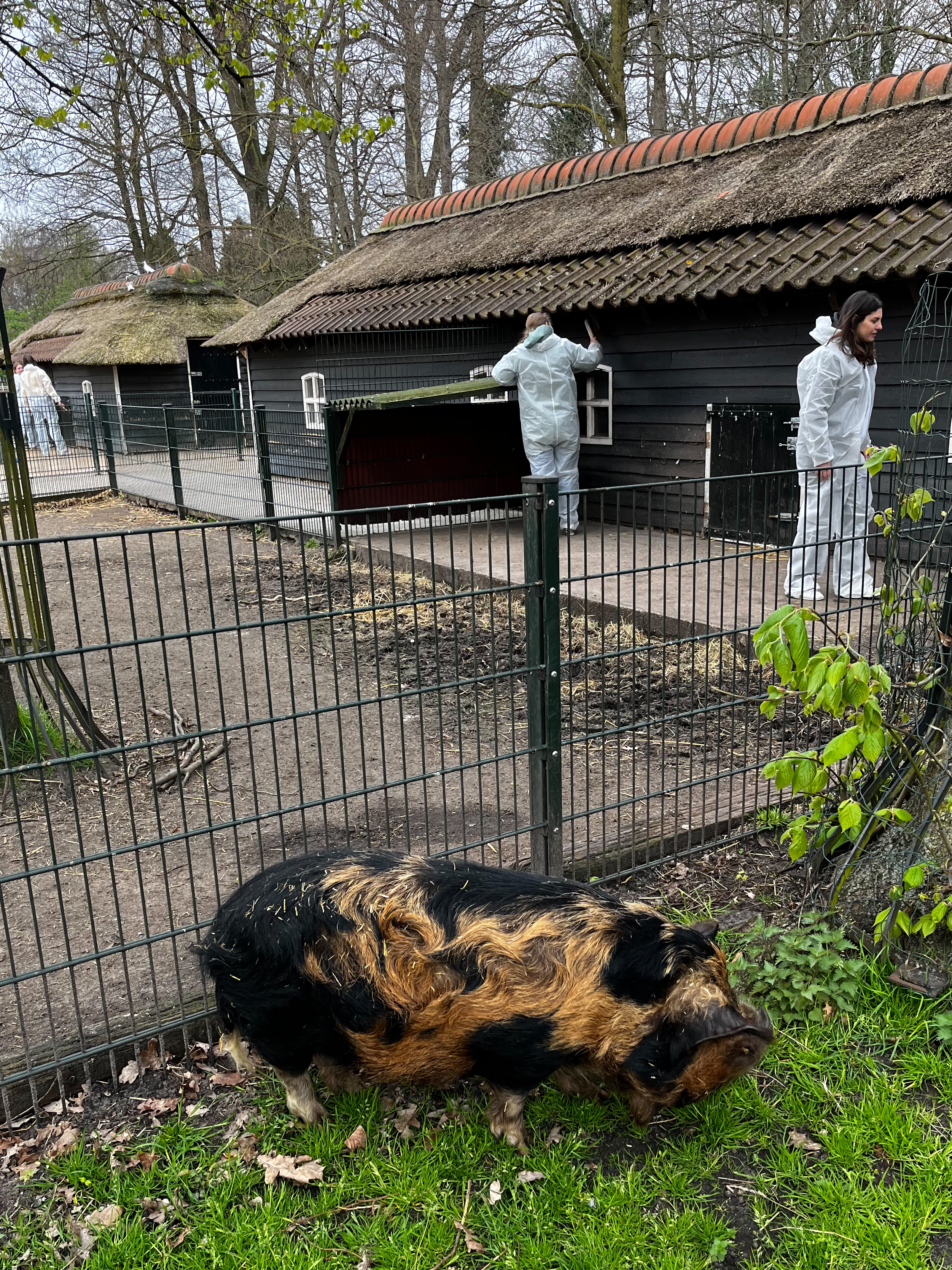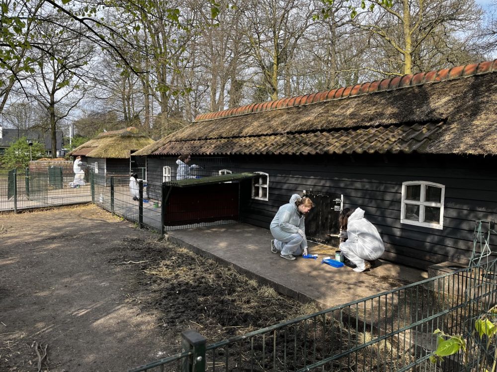 Ook met klussen zijn er soms buitenlandse groepen. Laatst waren er bijvoorbeeld 7 mensen van het bedrijf DLL. Zij krijgen vanuit hun werk de ruimte om vrijwilligerswerk te doen en hebben dit jaar onze boerderij uitgekozen. We hebben hen ontvangen met koffie en koek en zij hebben zich een beetje voorgesteld. Het was verrassend te horen dat ze uit zoveel verschillende landen kwamen: Canada, Philpijnen, Frankrijk, Italië en Rusland. Het werd een mengelmoes van talen en gedurende de dag kwam er steeds meer aan bod; over hun cultuur en de verschillen, talen die soms toch ook wel op elkaar lijken, de gebruiken wat bijvoorbeeld de lunch betreft. Grappig en gezellig. Het was een leuke groep die heel enthousiast aan het werk ging. Ze hadden al snel de buitenkant van de stallen van de varkens, geiten en schapen geschilderd. Die zagen er weer als nieuw uit. Wat een actie! Halverwege de middag hebben we met zijn allen een wandeling door het landgoed gemaakt met de ezels. Dat vonden ze erg leuk. Ondertussen werd er weer veel gevraagd en verteld. Daarna hebben we gezamenlijk de klusdag afgerond en zijn ze vertrokken. Iedereen is weer een heleboel wijzer geworden vandaag. Voor herhaling vatbaar!