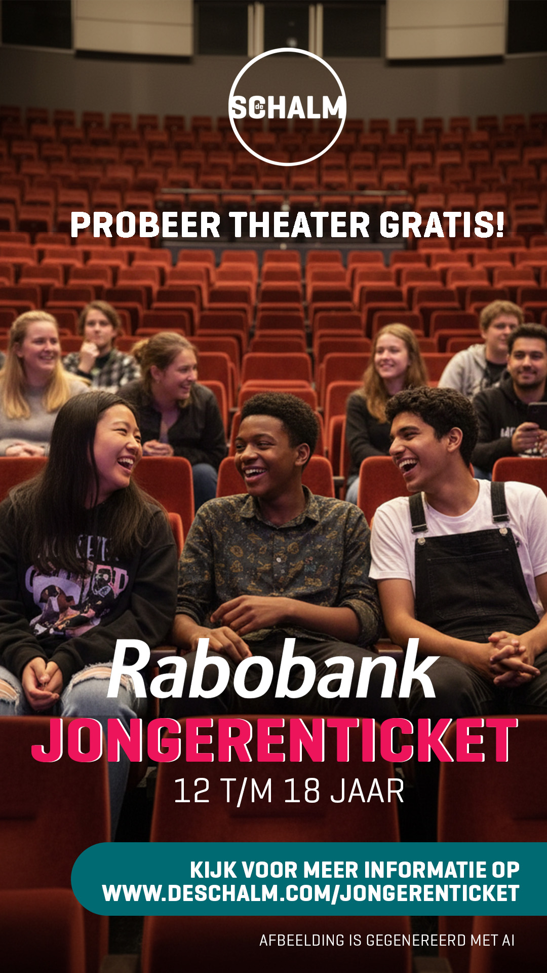 Jongeren tussen de 12 en 18 jaar kunnen vanaf zaterdag 24 januari gratis naar een geselecteerd voorstellingsaanbod in het theater. Op deze manier willen beide partijen jongeren stimuleren tot theaterbezoek. Deze doelgroep komt relatief weinig in het theater. Het aanbieden van gratis tickets bevordert een levenslange deelname aan cultuur. In Theater de Schalm kunnen kinderen tot en met 12 jaar al gratis voorstellingen die vallen binnen het genre Jeugd en Familie, door een samenwerking met ASML.