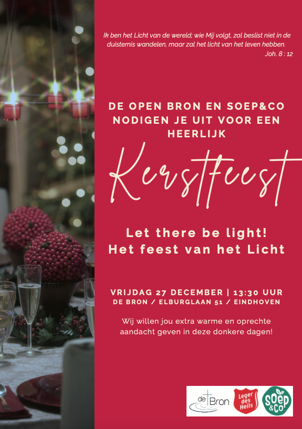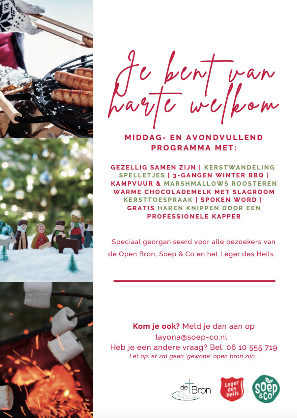 Kerstfeest op vrijdag 27 december, middag en avondvullend programma, georganiseerd door het Leger des Heils, kerkgemeenschap de Bron en Soep& Co voor dak- en thuislozen en bezoekers van de Open Bron (meer informatie zie bijgaande flyer)