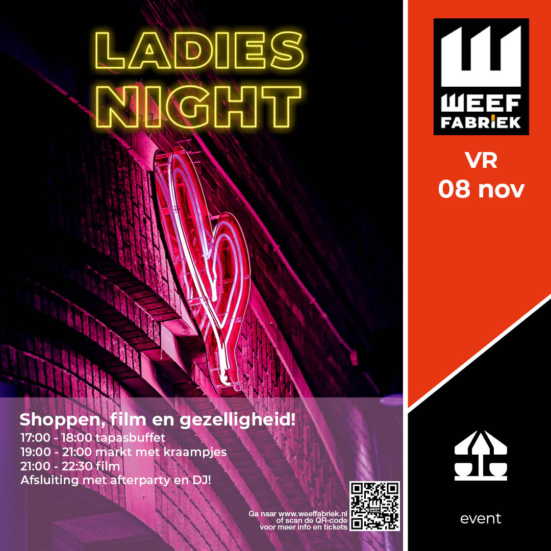 Op vrijdag 8 november organiseert de Weeffabriek in Geldrop een Ladies Night, een avond vol ontspanning, gezelligheid en entertainment! Dit is dé gelegenheid voor vriendinnen, zussen, buren of met wie je maar wilt om samen te genieten van een avondje uit. Vanaf 17:00 kun je al terecht voor een overheerlijk tapasbuffet. Er zijn diverse prijzen voor de Ladies Night.