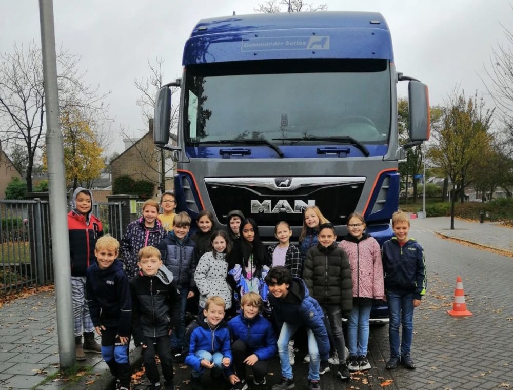 Om kinderen bewust te maken van de mogelijke gevaren van grote voertuigen in het verkeer verzorgen Transport en Logistiek Nederland (TLN) en Veilig Verkeer Nederland (VVN) een speciaal lesprogramma ‘Veilig op Weg’ voor leerlingen van de basisschool. Vrijdag 30 oktober gaf vrachtwagenchauffeur en instructeur Corina Hamer van TLN les aan groep 7 en 8 van BS De Hobbitstee in Eindhoven. De leerlingen leerden de twee vuistregels: ‘Blijf rechts en ruim achter grote voertuigen’ en ‘Houd minstens drie meter afstand’.