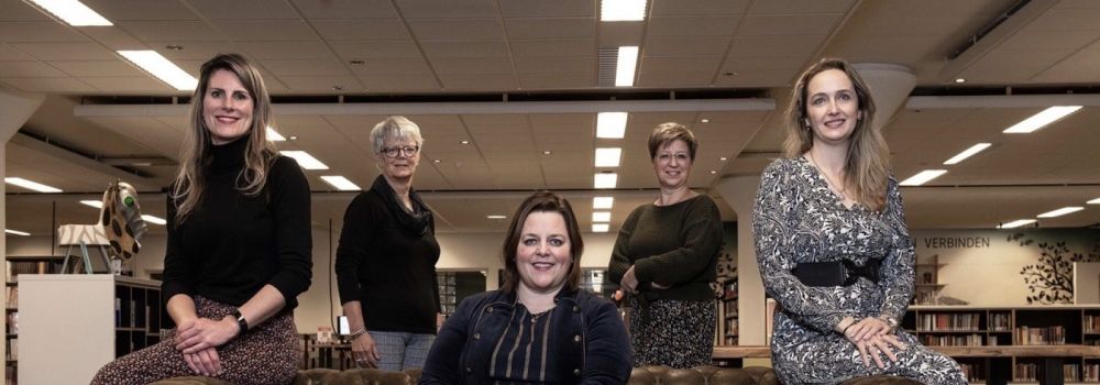Foto(v.l.n.r.) Daniëlle Bax, Annemieke Scharloo, Carin van Holstein, Nicole Braakman en Tosca Goes geven loopbaanadvies vanuit de Bibliotheek Veldhoven.