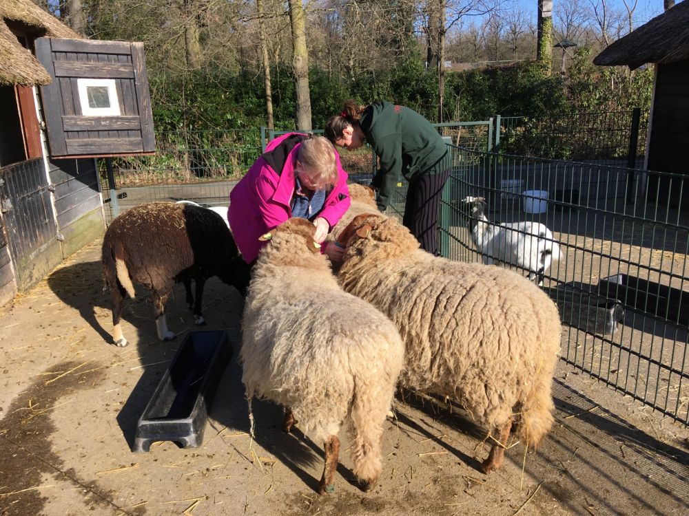 We horen zo vaak als er nieuwe vrijwilligers als dierverzorger ingewerkt worden: voeren dat is gemakkelijk, je gooit gewoon wat brok in een bak. Ja, dat lijkt zo inderdaad maar bijna iedereen heeft 5-6x inwerkdagen nodig om goed te kunnen voeren. Soms duurt het nog langer. We hebben een mooi voorbeeld over hoe ingewikkeld het kan zijn: Bij Kasteel Kinderboerderij wonen 9 schapen. Twee daarvan, Rachel en Lola, zijn wat ouder en hebben een slecht gebit. Ze kunnen geen hooi meer eten en dat is vervelend want hooi is juist het belangrijkste voer voor schapen. Daarom krijgen ze geweekte pulp. Daar zitten, net als in hooi, lange vezels in die zo belangrijk zijn voor hun gezondheid. Ze eten dit apart van de andere schapen in de stal. Nu zijn dat meteen twee lastige dingen: hoe krijg je deze twee schapen in de stal zonder dat de anderen erbij komen? Een schaap loopt als kudde en zeker als er wat lekkers is, komen ze allemaal. Je moet erop letten dat er geen brok naast de voerbak valt want als het op de grond ligt eten de meeste dieren het niet meer op. En als eerste: hoe herken je van de vier donkerbruine schaapjes welke twee je moet hebben? Natuurlijk, ze hebben oormerken, maar als alles door elkaar heen beweegt kun je dat niet lezen. Als je deze puzzels hebt opgelost, komt de volgende uitdaging: er zijn op dit moment twee drachtige schapen en die moeten extra voer hebben. Probeer maar eens in een krioelende kudde de juiste twee uit een bakje te laten eten zonder dat de rest van de hoofden daar ook in duiken. En dan weer: welke schapen zijn het nou precies? Die lichte schapen lijken zo op elkaar! Soms lukt het om te leren de schapen uit elkaar te houden, er hangt een “schapen smoelen boek” waarop elk schaap staat met foto en omschrijving. Verder: oefening baart kunst. Op een gegeven moment leer je snel te werken en ken je het schapen gedrag een beetje. En schapen zijn gewoonte dieren die na een aantal keren proberen weten wat de bedoeling is. Dan gaat het allemaal wat gemakkelijker.