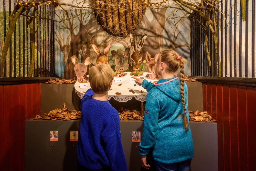 Ben jij een speurneus, en kun je de juiste dieren hangen bij de prenten (pootafdrukken)? Ga jij de poepdoosjes openen, en raden welke dieren gekakt hebben? Wil jij zien hoe een groep dieren samen aan tafel eet in een donker hol? Bekijk je meteen even de dierenfilmpjes? Of maak je liever een ritje op het houten paard in de laatste paardenbox? In het koetshuis zijn mooi ingerichte vitrines die met de tentoonstelling te maken hebben, en er draait een documentaire met beeldmateriaal van IVN-fotografen.