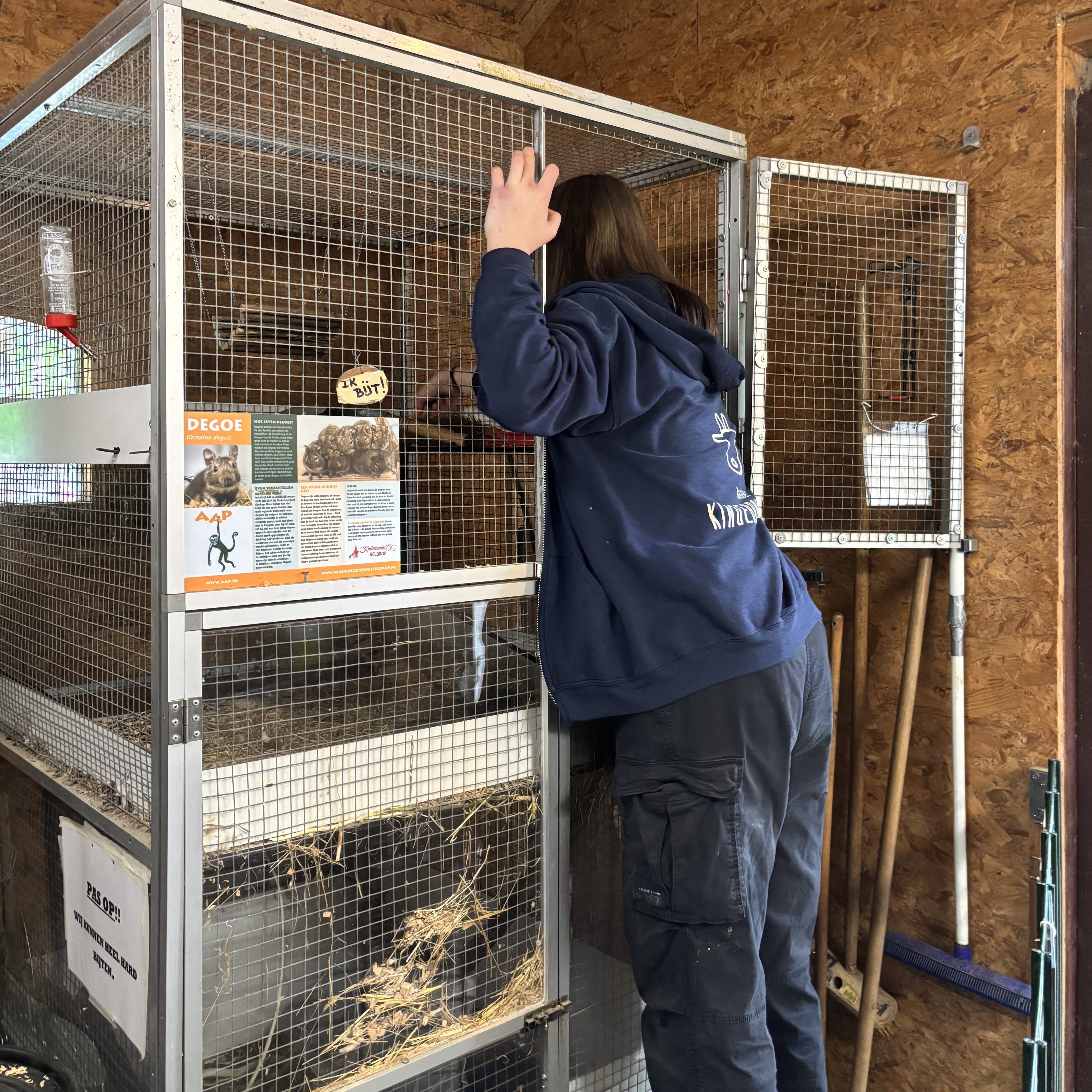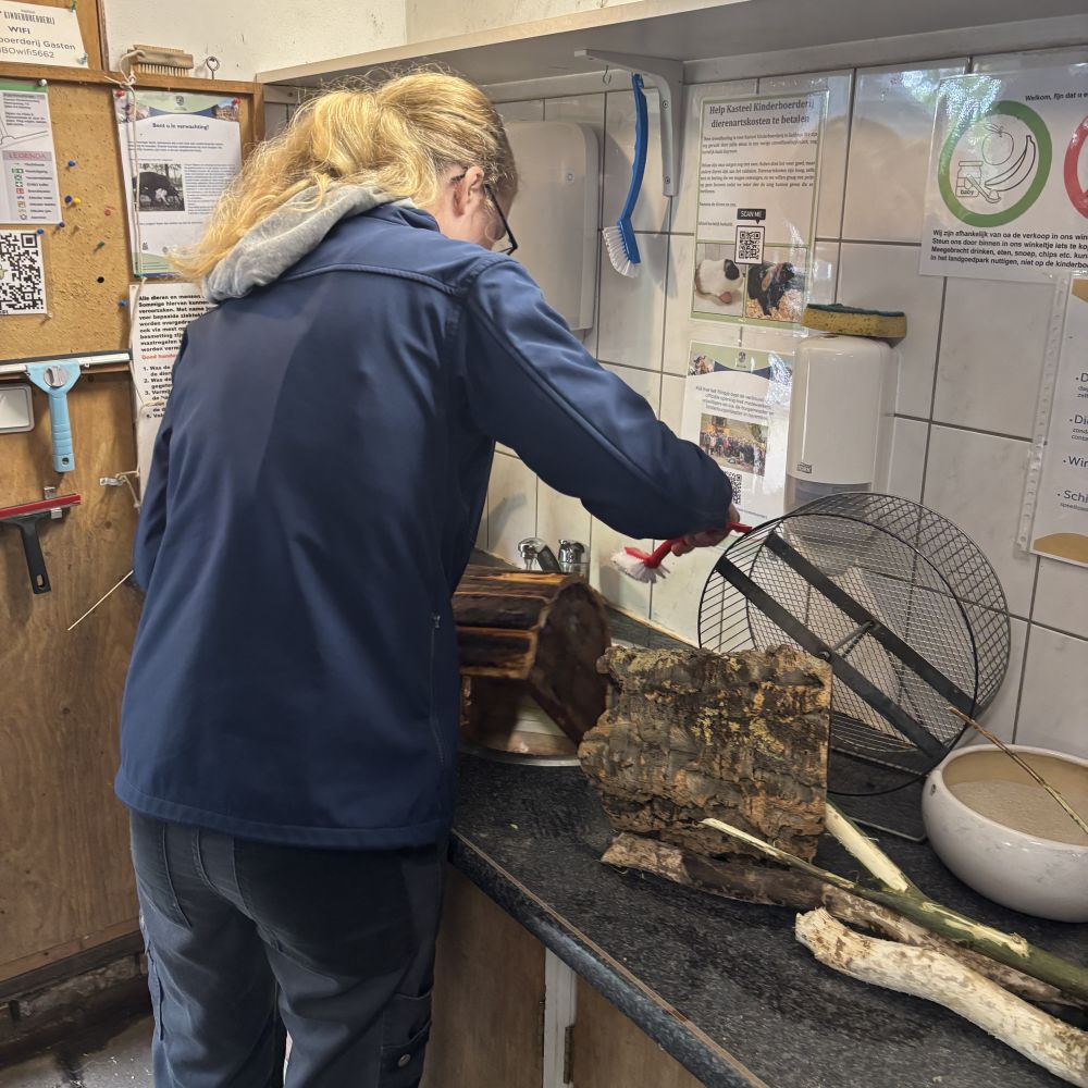 Elk jaar zijn er verschillende stagiair(e)s bij de kinderboerderij. Veel van hen komen van Yuverta, de dierverzorgers opleiding in onder andere Den Bosch en Helmond, anderen komen van opleidingen zoals bijvoorbeeld Silverlinde (natuurdiergeneeskunde). Daarnaast zijn er geregeld maatschappelijke stages en snuffelstages: mensen van middelbare scholen die een paar weken of 1-2 dagen meedraaien om eens te beleven hoe en bedrijf draait. We proberen dan zoveel mogelijk van wat er gebeurt op een boerderij mee te geven en te laten ervaren. Dat vraagt tijd en uitleg van het beheer en de dierverzorgers die vaak in de praktijk met hen werken. Stagiair(e)s op een bedrijf hebben neemt de boerderij serieus. Liever een kleiner aantal per jaar en daar tijd in investeren dan heel veel waar geen tijd voor gemaakt kan worden. Er worden momenten ingepland voor begeleiding door het beheer. Het kost tijdsinvestering maar het levert de boerderij ook iets op. Namelijk: een frisse blik op hoe er gewerkt wordt, de nieuwste inzichten en kennis die we soms ook kunnen gebruiken, er wordt door het beheer dan ook steeds kritisch naar het eigen werk gekeken en er komen soms ook leuke, bruikbare ideeën uit die overgenomen worden. Het is altijd prettig om nieuwe mensen rond te hebben lopen. Dit jaar zijn bijvoorbeeld er twee jeugdvrijwilligers die al een tijd bij de boerderij werken, die eindexamen dierverzorging gedaan hebben en daarvoor hun stage bij de kinderboerderij konden uitvoeren. Dat is helemaal leuk omdat zij al een basis hebben maar dan anders naar het bedrijf moeten gaan kijken en die opeens informatie nodig hebben waar het normaal niet zo snel over gaat: financiën, beleid, bepaalde administratie etc. Voor het beheer is dat interessant omdat er gesprekken plaats vinden waardoor er opnieuw nagedacht moet worden waarom er iets zo gebeurt. Of het geeft juist de bevestiging dat bepaalde onderwerpen hier best goed voor elkaar zijn. Zo helpen we elkaar. Het gebeurt ook wel eens dat stagiair(e)s na hun stage als vrijwilliger blijven hangen. We vinden het jammer dat de maatschappelijks stages niet meer verplicht zijn omdat daaruit altijd een clubje jeugdvrijwilligers in het weekend bleven hangen en dat was erg gezellig. De Kasteel Kinderboerderij is een geliefd stageadres. Er wordt vaak gecommuniceerd dat hier zoveel tijd voor begeleiding van het individu genomen wordt. Er zijn namelijk best een aantal mensen die de opleiding dierverzorger doen en die (mentale) problemen hebben waardoor er meer tijd voor begeleiding nodig is. Er wordt zorgvuldig afgewogen aan wie wel en wie niet de gevraagde begeleiding geboden kan worden. Helaas blijkt elk jaar opnieuw dat er heel veel stagiair(e)s zijn die een stageplaats zoeken maar er kunnen er maar een paar gehonoreerd worden. We doen ons best.