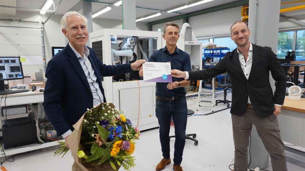 Glunderende directeuren Pierre van Lamsweerde en Tim Koene van high tech-bedrijven Tegema en Effect Photonics, die een cheque van € 50.000 in ontvangst nemen uit handen van wethouder Jan Boersma van Economische Zaken. Boersma reikt de stimuleringssubsidie uit namens het Stimuleringsfonds van de 21 gemeenten in de regio, verenigd in de Metropoolgemeente Eindhoven (MRE).