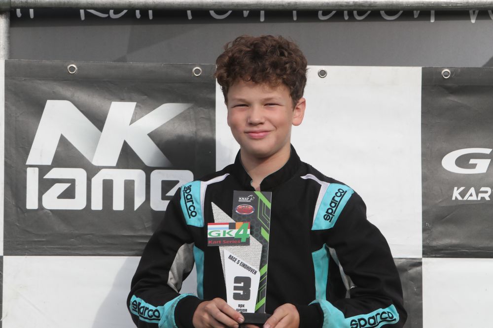 En jawel, zo stond Conner Westerhof na afloop van de vijfde ronde van de GK4 Kart Series in eigen stad dus toch op het podium. De twaalfjarige Eindhovenaar had een pittig begin van het weekeinde gehad, gaf niet op en kreeg loon naar werken. Hij werd nog knap derde in de Honda 9PK Junior-klasse!
