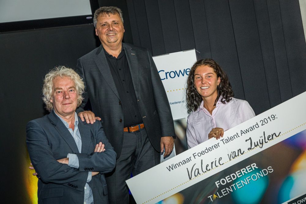 Bijschrift: winnaar Valerie van Zuijlen met (midden) Johan Daams (CEO Crowe Foederer) en (links) Ronald Ramakers (directeur Stichting GLOW