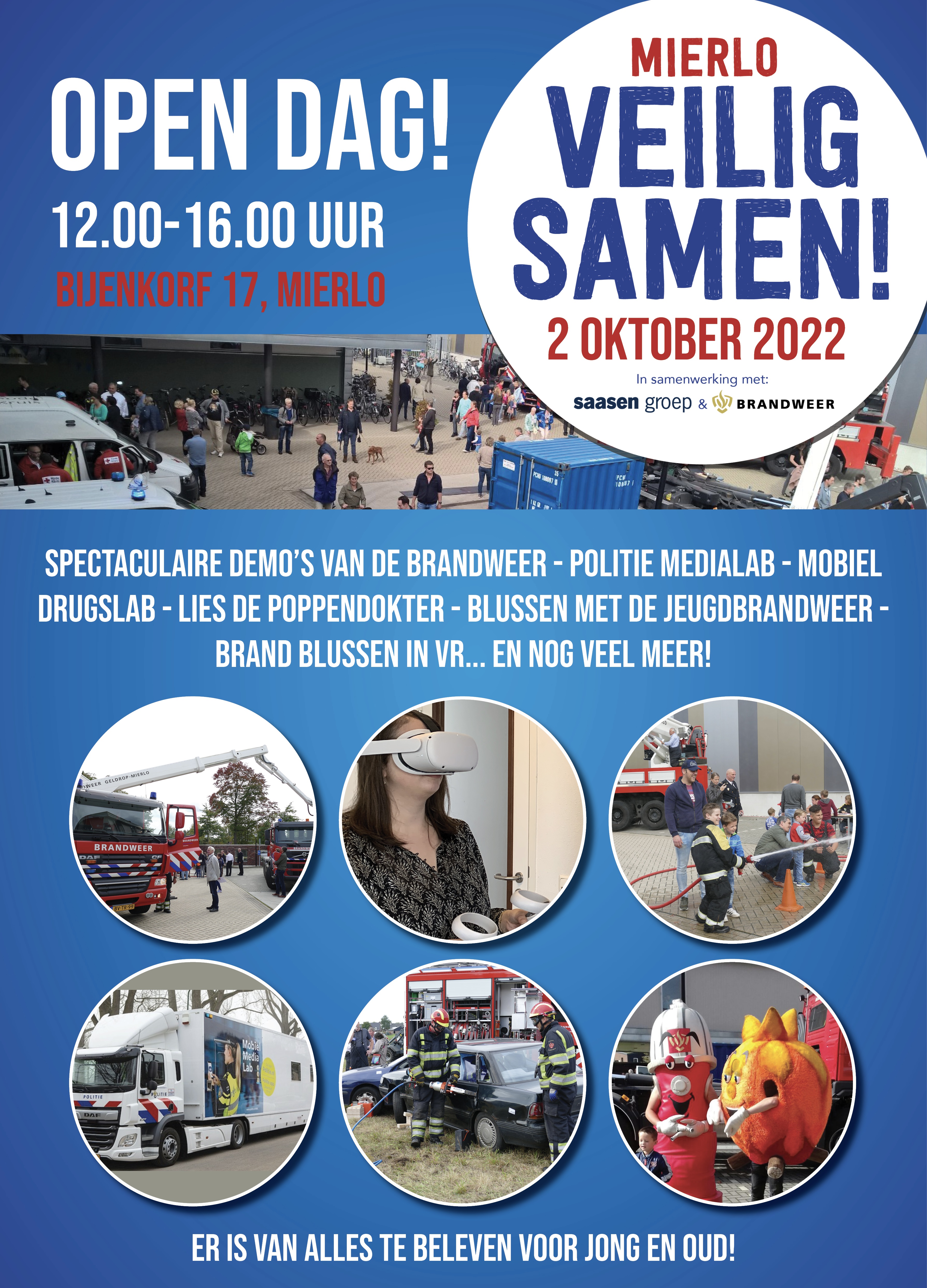 In en rondom het gebouw van Saasen Groep/brandweer zal van alles te zien en te doen zijn rondom het thema veiligheid. Uiteraard pakt de brandweer groots uit en kunnen de kinderen onder andere een ritje maken in de brandweerwagen en een spuitdiploma behalen bij de jeugdbrandweer. De politie is o.a. aanwezig met een groot Media Lab en kan men in een andere opstelling ervaren hoe een drugslab er in het echt uit kan zien. In het gebouw zal Saasen Groep u meenemen in de wereld van VR (Virtual Reality). Daarnaast zullen ook de EHBO vereniging uit Mierlo en het NIBHV aanwezig zijn tijdens de open dag. Voor de kinderen staat er ook nog een springkussen, kunnen ze grimeren met de lotus slachtoffers en op de foto met de populaire “Billy Brandkraan”.