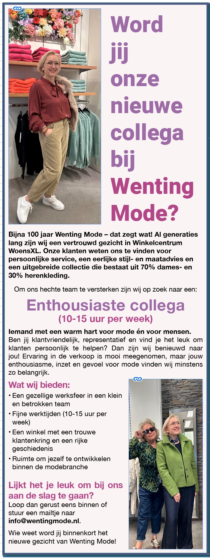 Lijkt het je leuk om bij ons aan de slag te gaan? Loop dan gerust eens binnen of stuur een mailtje naar info@wentingmode.nl. Wie weet word jij binnenkort het nieuwe gezicht van Wenting Mode!