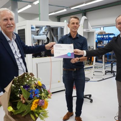 Glunderende directeuren Pierre van Lamsweerde en Tim Koene van high tech-bedrijven Tegema en Effect Photonics, die een cheque van € 50.000 in ontvangst nemen uit handen van wethouder Jan Boersma van Economische Zaken. Boersma reikt de stimuleringssubsidie uit namens het Stimuleringsfonds van de 21 g