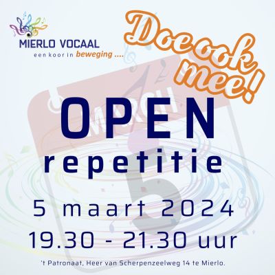 Op dinsdag 5 maart 2024 houdt Mierlo Vocaal een open repetitie. Vind jij samen zingen ook zo leuk of wil je onderzoeken of zingen in een koor bij je past? Meld je dan snel aan voor de open repetitie! Wat kan je verwachten Mierlo Vocaal is een gemengd koor bestaande uit sopranen, alten, tenoren
