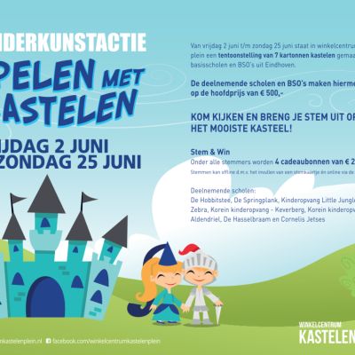 Vanaf vrijdag 2 juni staat in winkelcentrum Kastelenplein een tentoonstelling van kastelen. De kartonnen kastelen zijn beschilderd en versierd door basisscholen en BSO ’s uit Eindhoven. De scholen en BSO ’s maken met hun deelname aan de kinderkunstactie kans op mooie prijzen. Kinderkunstactie ‘Sp